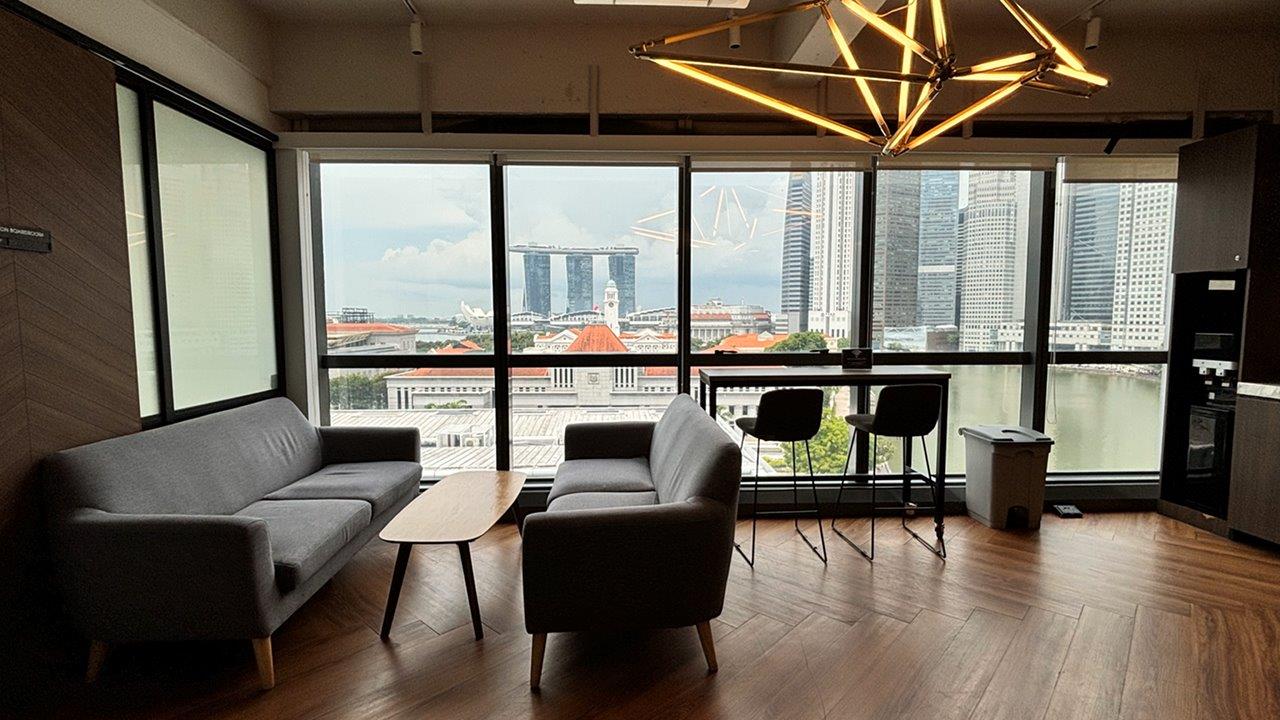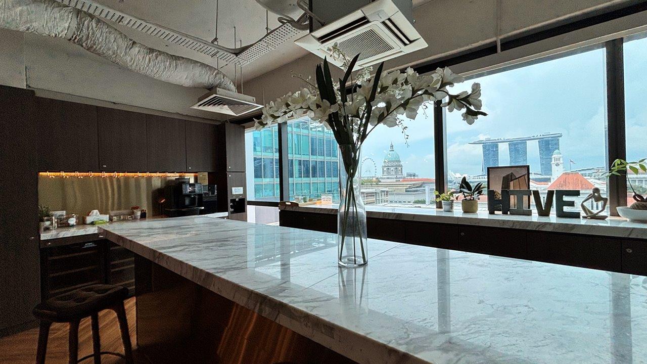 The office itself is spread across two floors and includes counter seats overlooking the river, allowing natural light to create a bright and peaceful workspace. Additionally, The Hive North Bridge Road within this center enhances the offering with its spectacular panoramic views of the Singapore skyline and beautifully designed coworking spaces that combine city centre convenience with a creative and dynamic atmosphere.