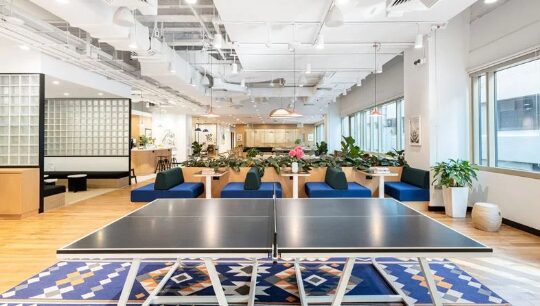 Set atop Funan Mall, WeWork at 109 North Bridge Road occupies the top two floors with spacious, art‑filled lounges, vibrant shared areas, and sleek private offices — mingling workspace and lifestyle seamlessly.
